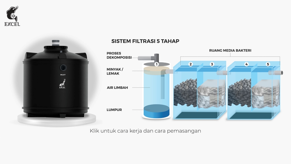 Dilengkapi dengan sistem filtrasi lima tahap, Tangki Bioseptic EXCEL akan memastikan bahwa limbah rumah tangga akan diuraikan secara efisien dan hemat biaya!